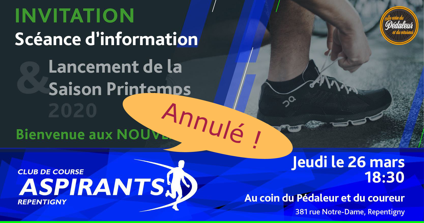 Séance d’information annulée Publié le 16 mars 202016 mars 2020 par paulinestp Prendre note qu’en raison de la situation exceptionnelle qui sévit actuellement au Québec à cause du coronavirus – LA SÉANCE D’INFORMATION PRÉVUE LE 26 MARS POUR LE LANCEMENT DE LA SAISON DE PRINTEMPS A ÉTÉ ANNULÉE. (16/03/2020)