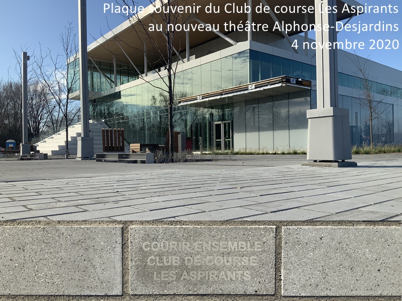 On découvre avec plaisir aujourd’hui la plaque souvenir commandée l’an dernier par le Club de course Les Aspirants et installée aux abords du nouveau théâtre Alphonse-Desjardins qui devrait accueillir ses premiers visiteurs très bientôt !